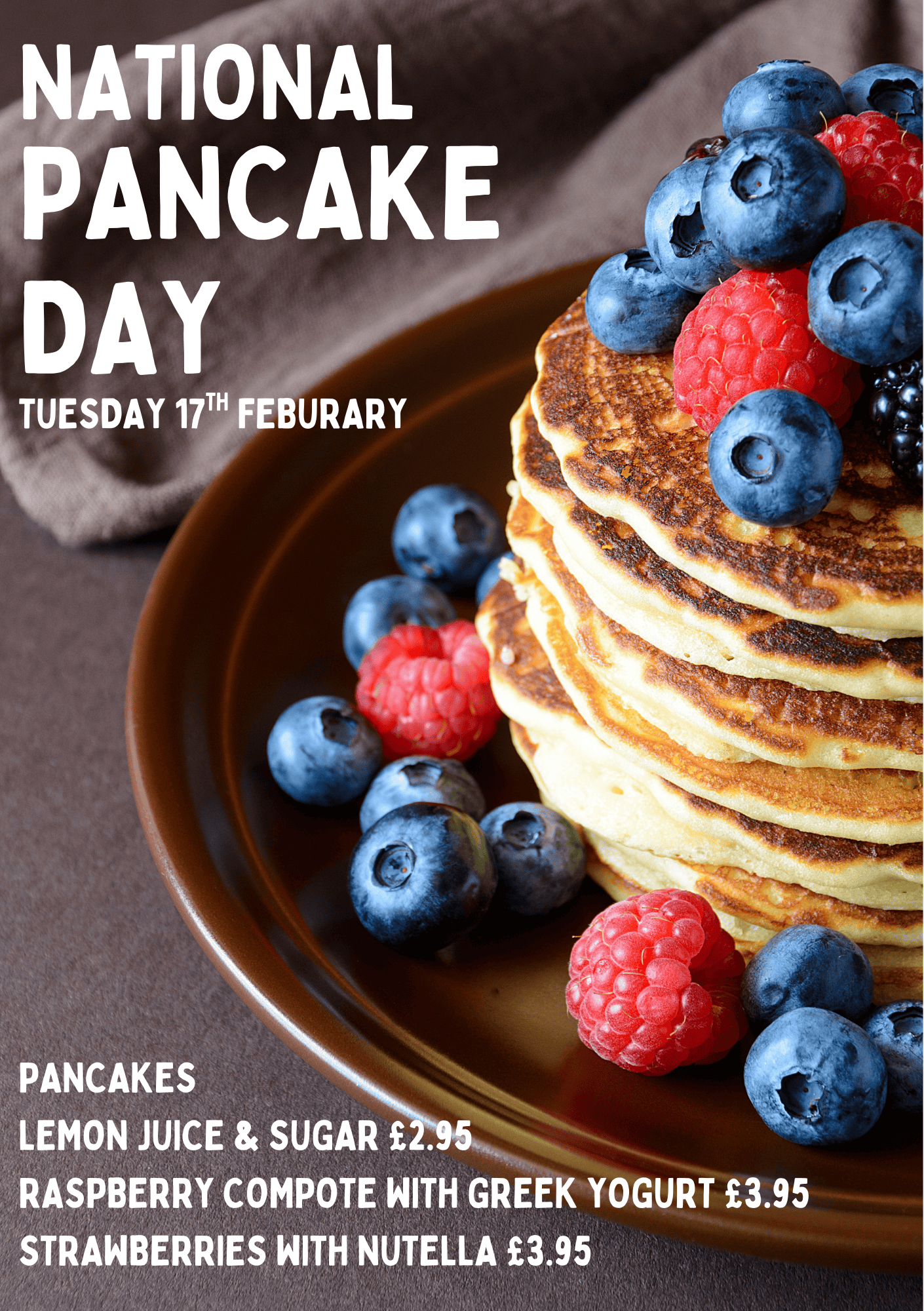 Join us for Pancake Day and enjoy freshly prepared pancakes with your favorite toppings